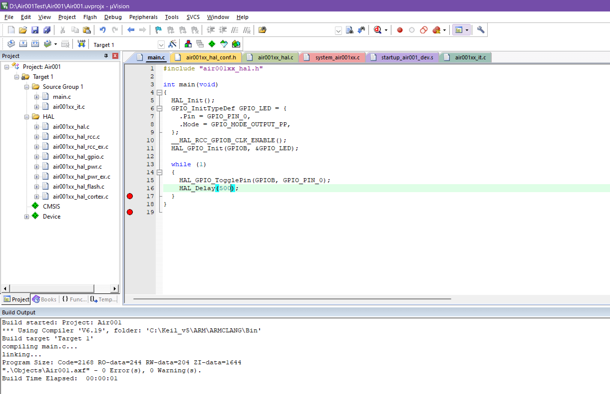 在Keil中添加用到的外设的源文件,一个最小的基于HAL库的工程至少需要添加air001xx_hal_rcc.c、air001xx_hal_rcc_ex.c、air001xx_hal_pwr.c、air001xx_hal_pwr_ex.c、air001xx_hal_cortex.c、air001xx_hal_flash.c、air001xx_hal.c