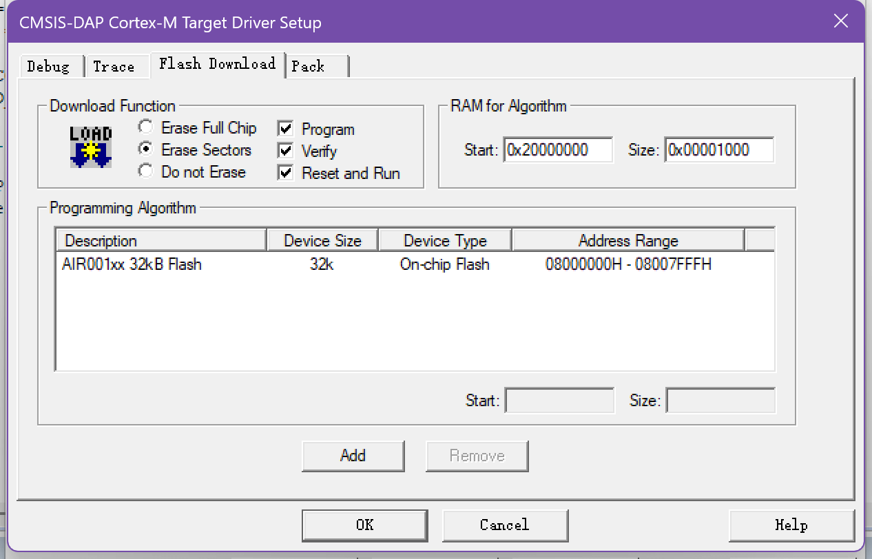 Flash Download页面,根据目标芯片的型号选择对应的算法,并勾上Reset and Run的勾