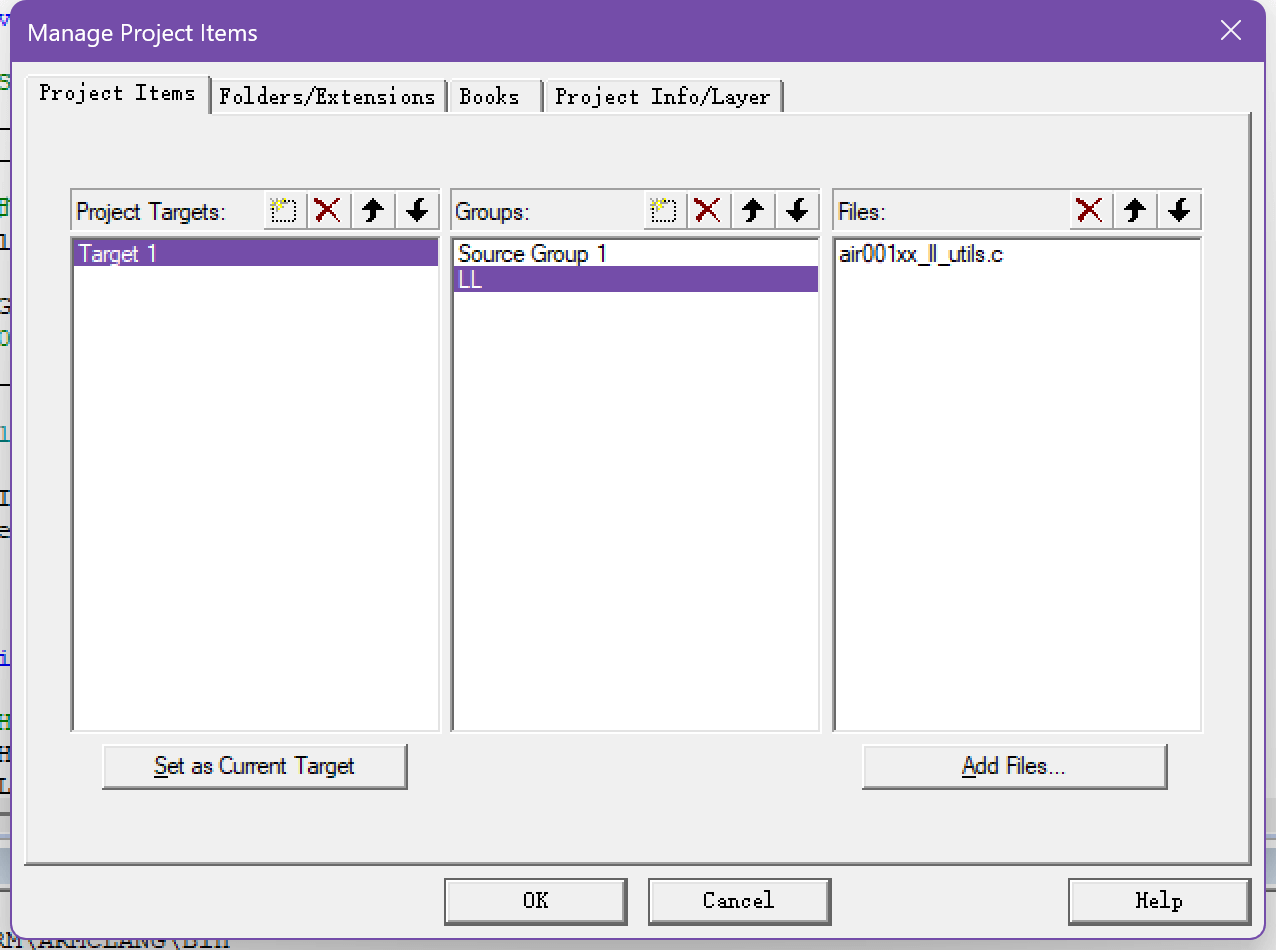 在Keil中添加用到的外设的源文件,一个最小的基于LL库的工程至少需要添加air001xx_ll_utils.c